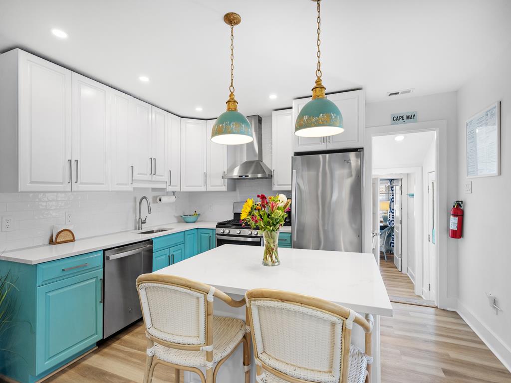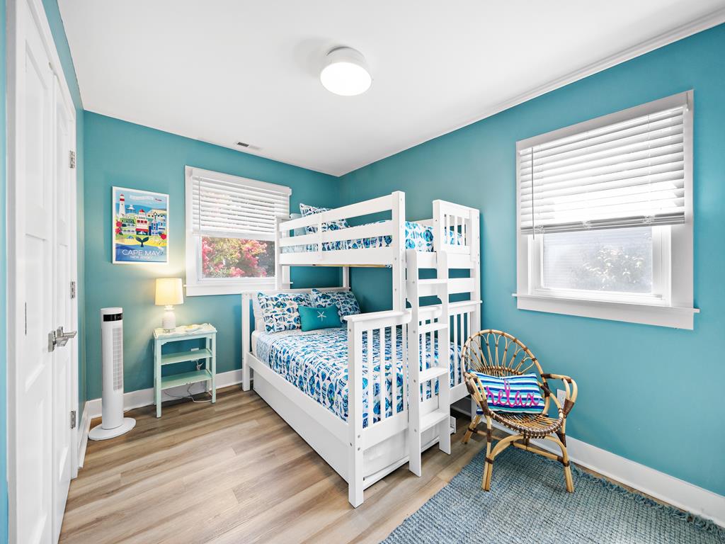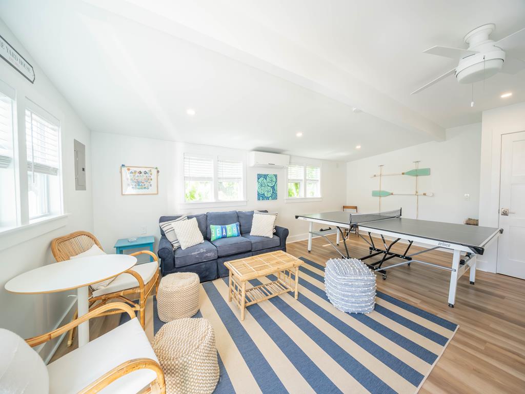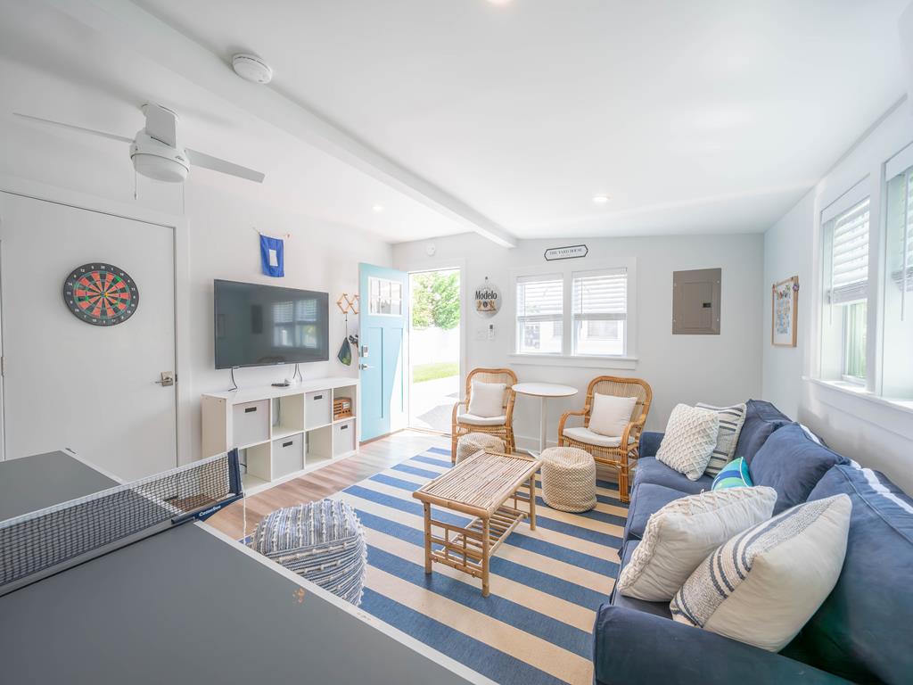 Come enjoy a stay at Sea Star Cottage, a super stylish home close to Cape May's downtown and beautiful beaches! As soon as you arrive you are welcomed by the matching front porch swings where you can enjoy your early mornings or afternoons/evenings after a full day in Cape May. Upon entering you are met with an open concept living/dining/kitchen layout that is both spacious and inviting. The kitchen is fully stocked for all your cooking needs, dining table seats 6 with additional island seating for 2, and the living space has a comfy couch and chairs for all to kick back and relax. The 2 guest bedrooms, one with a full bed and the other with a pyramid bed (twin over double) plus a twin and hall bath with soaking tub are off the main living area. The primary bedroom is in the back of the house past the powder room and laundry room. It boasts tons of natural light, privacy and a beautifully tiled custom walk-in shower. The cottage has a private fenced in yard with Adirondack chairs, and a newly finished custom indoor/outdoor recreational retreat with a 55" smart TV, couches, ping pong table, darts and other games for those fun nights with family and friends! Stacked parking for 3 cars and plenty of free street parking. $325 cleaning fee on all stays. Come enjoy all Cape May has to offer while staying at this adorable cottage!