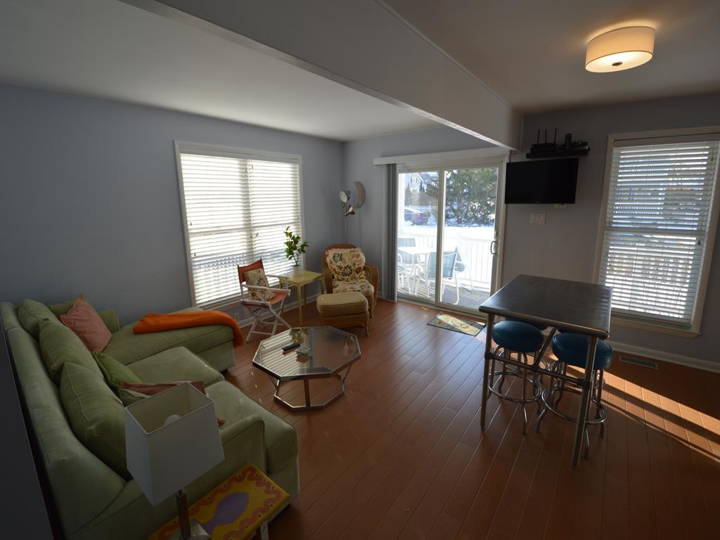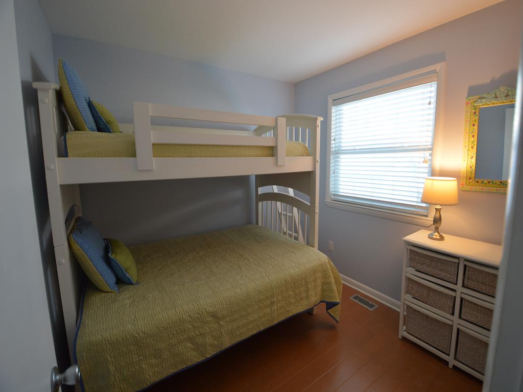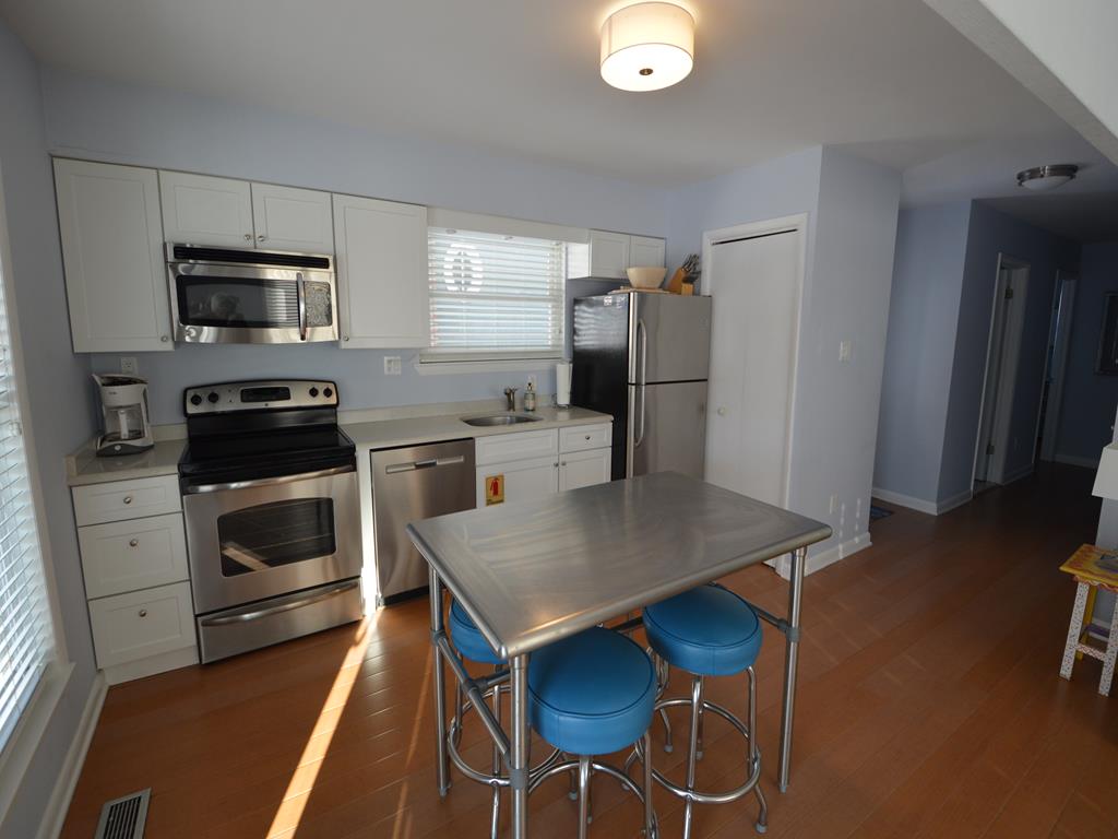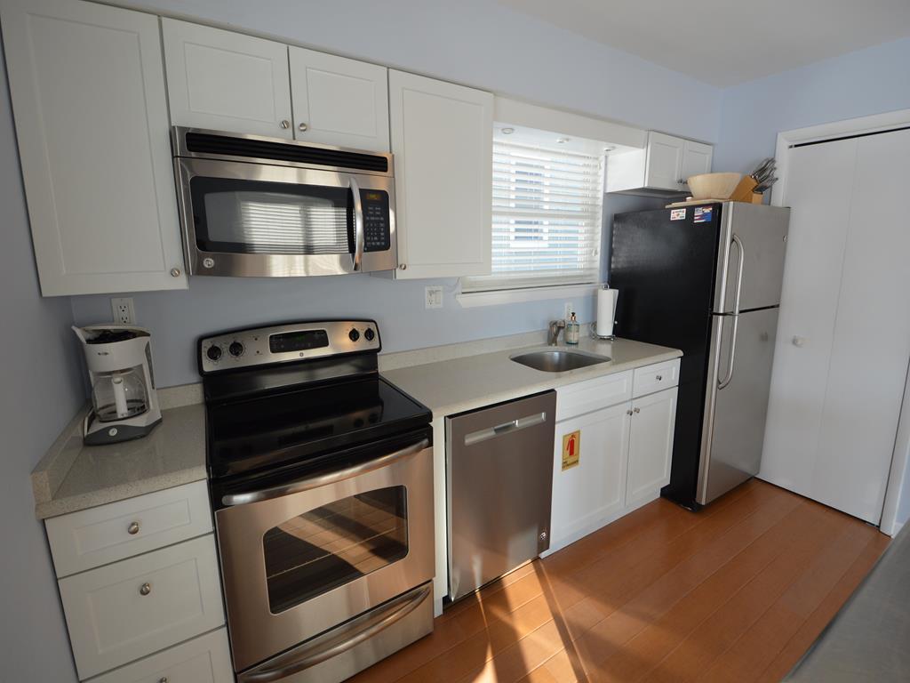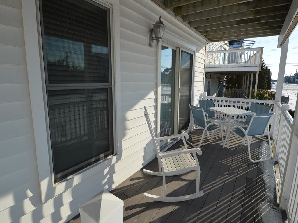 Prime south end location for your Stone Harbor vacation! Attractive 1st floor condo features a covered porch with southern exposure, perfect for outdoor meals and relaxing. The main living space has an open floor plan with ample natural light. This area has comfortable seating, a Smart TV with cable, a high top dining table and 4 stools, and fully equipped kitchen. The hall bathroom has a walk in stall shower. There is a stack washer and dryer. The primary bedroom has a queen bed. This room has a full size closet plus extra storage nooks. The guest bedroom features a twin over full size bunk bed. This room also has a closet. There is an outside shower, propane gas grill, and off street parking exclusive for this unit.