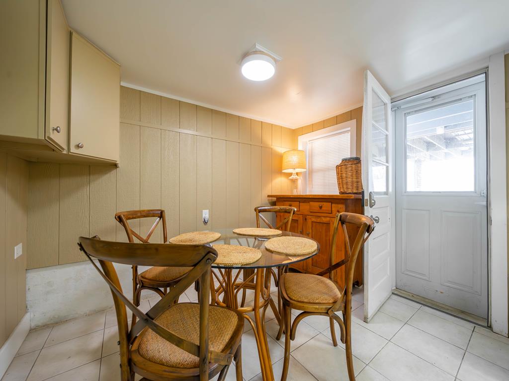 There is a fully equipped kitchen complete with a stove, microwave, toaster oven, full-size refrigerator, Keurig coffee maker, and all the cooking utensils you need to whip up delicious meals. Enjoy your culinary creations at the dining table with seating for 6, or take the meal outside to the outdoor dining area with seating for 6 as well.