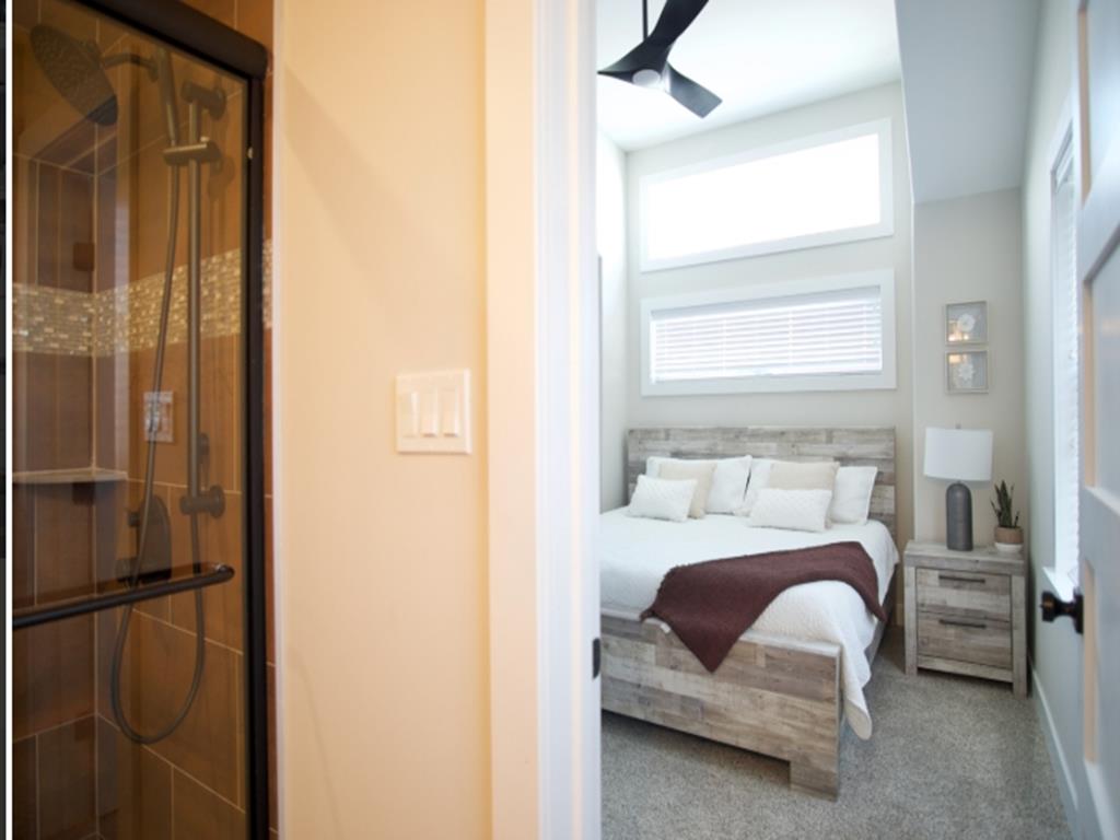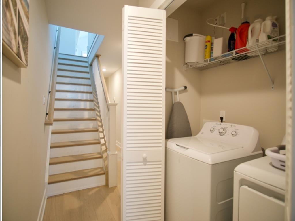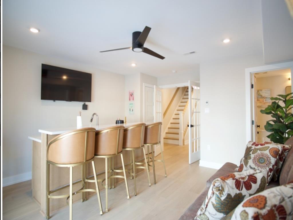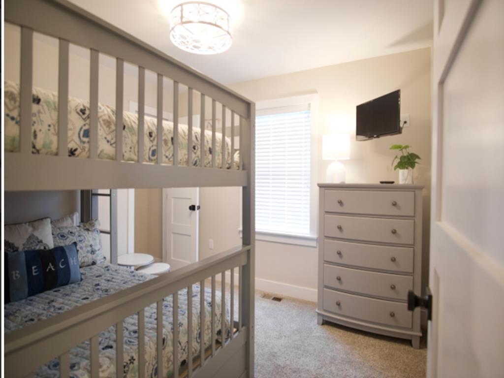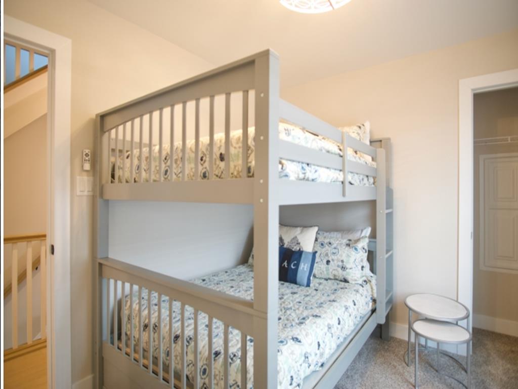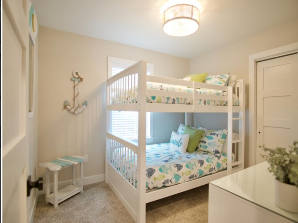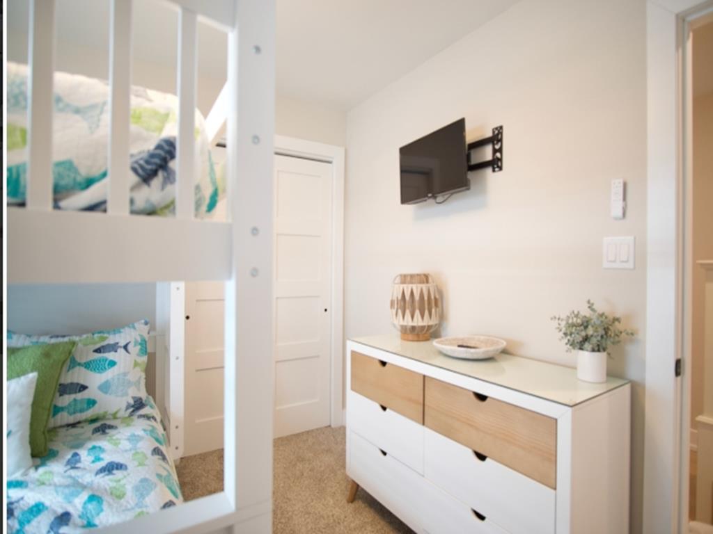 As you enter, you'll be welcomed by a stylish wet bar and seating area, setting the tone for your vacation. The first floor features a King bedroom, offering a quiet retreat with easy access to the rest of the home. Heading upstairs to the second floor, you'll find a washer and dryer for added convenience, along with three bedrooms – two featuring double bunk beds and the other a King bed, offering plenty of sleeping arrangements for you and your group.