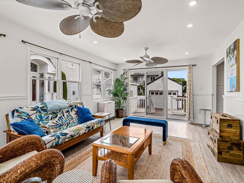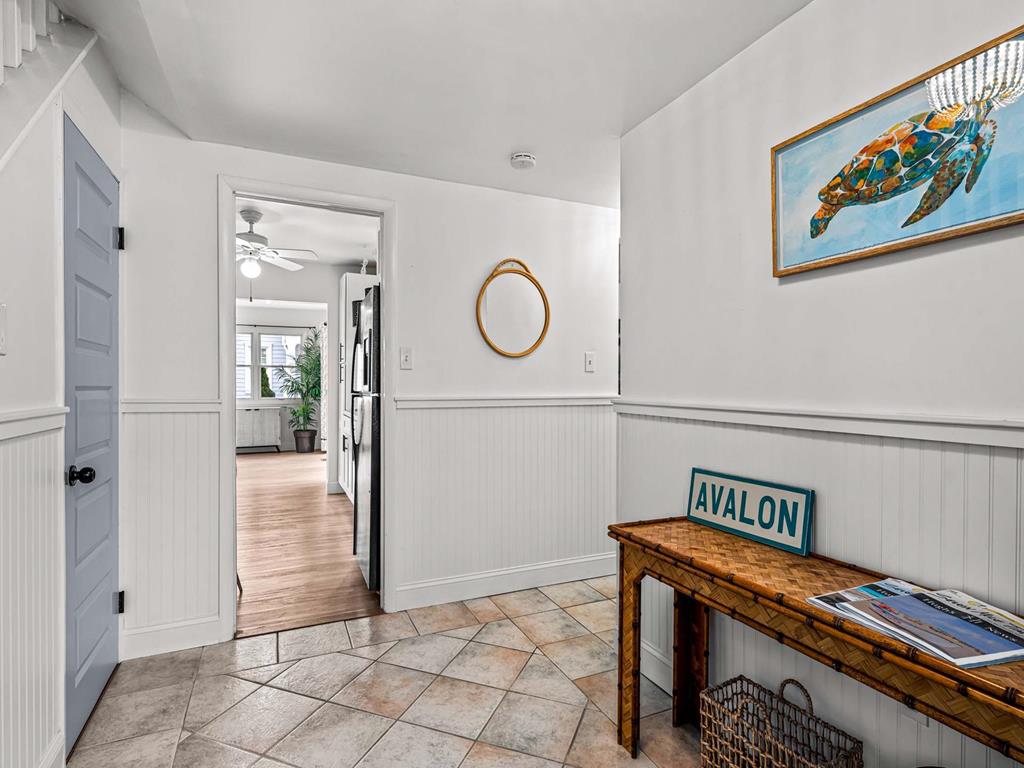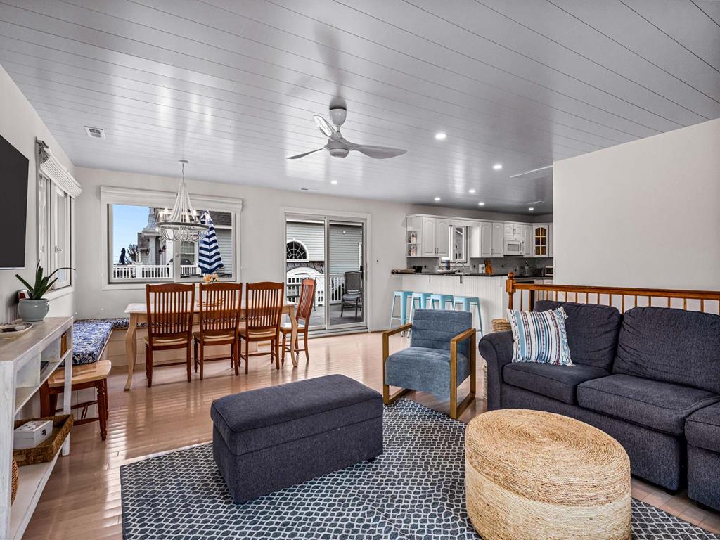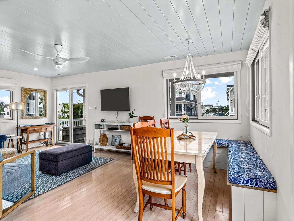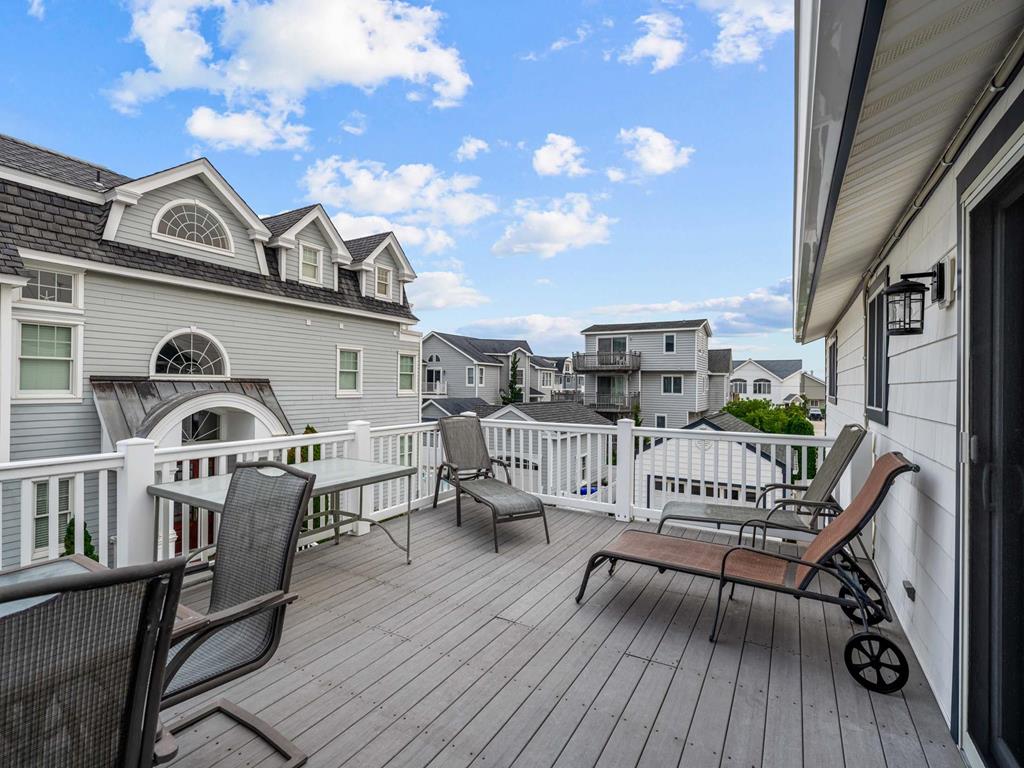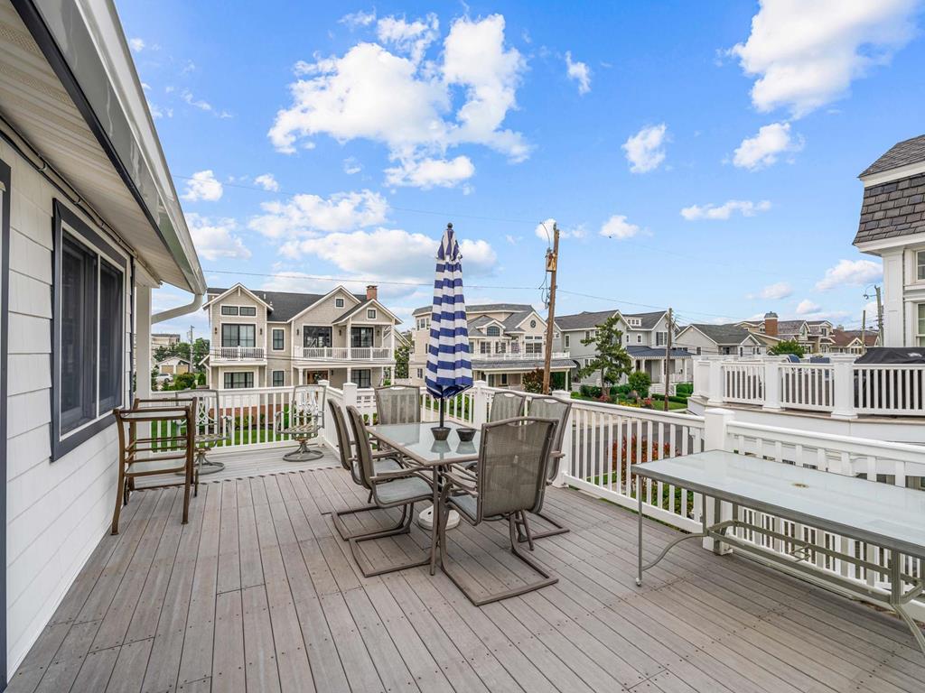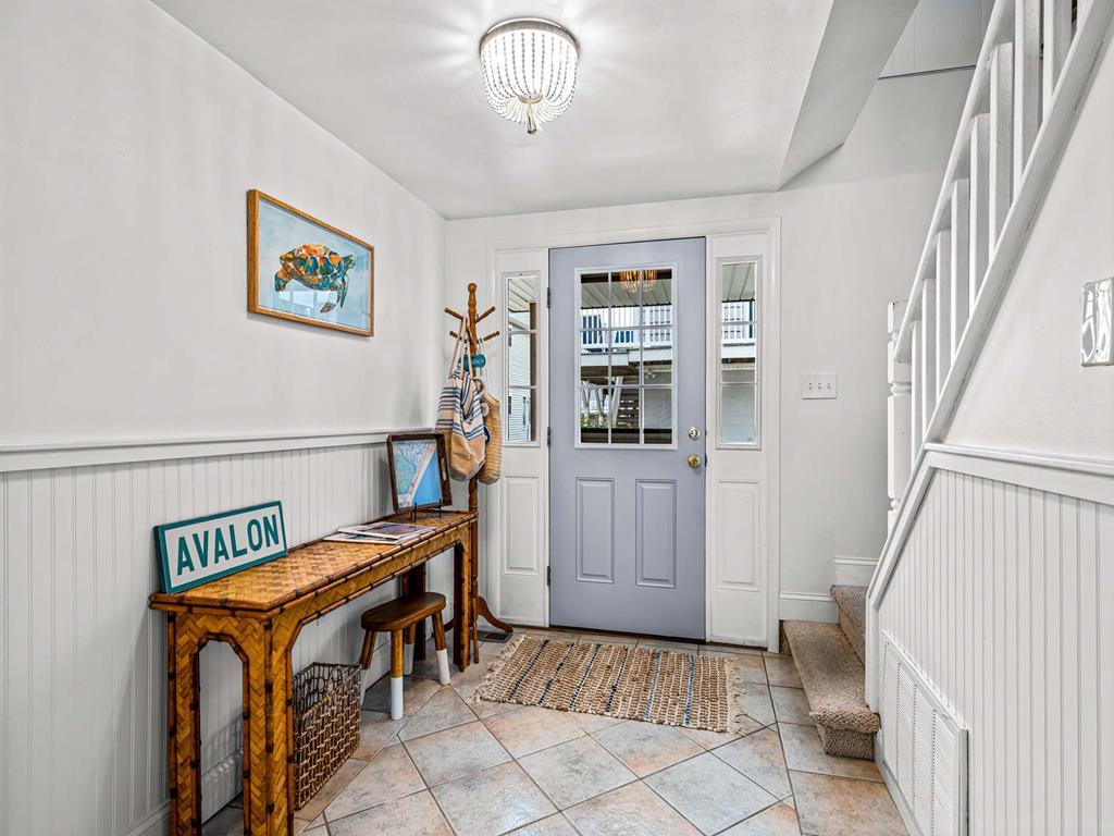 Recently updated this 5 bedroom, 4 bathroom single family home is just 11 homes from the beach path in the south-end of Avalon. The property has been newly furnished, painted, new flooring and exterior upgrades. The first floor consists of a large family room, bar area, 3 bedrooms, a full hall bath, laundry and powder room. Bedrooms include a king ensuite with walk in shower, a queen bedroom and a bedroom with a queen & twin trundle. Enjoy the ocean views from the second floor with an expansive wrap around deck, large family room open dining area and kitchen, all outfit with a gorgeous shiplap ceiling. Seating is never an issue with a dedicated dining area and peninsula seating in the kitchen. A full hall bath is located just off the kitchen area. Towards the rear of the second floor, another king primary ensuite and a bedroom with a set of twins. This home is pet friendly and impeccably maintained! With just a short bike ride to Avalon and Stone Harbor, this central location truly lends itself to the best beach living you will find. Book your family vacation now to enjoy everything Avalon has to offer. Owner offers YouTube TV streaming.