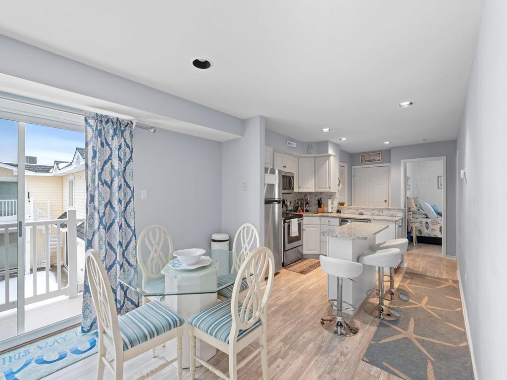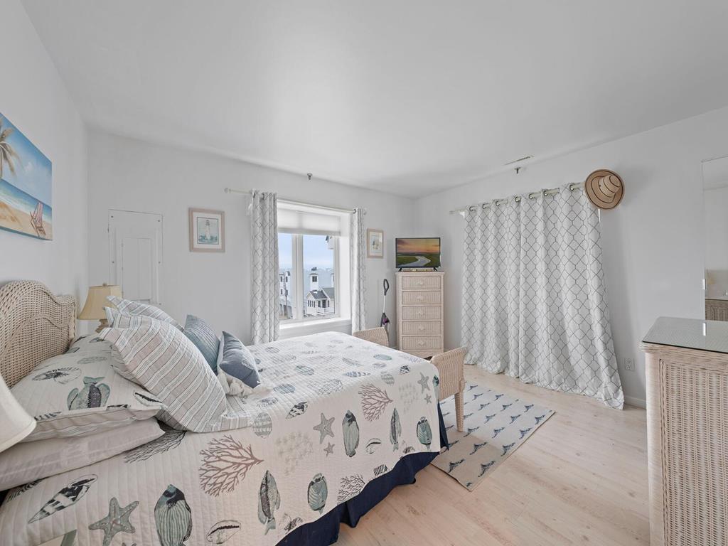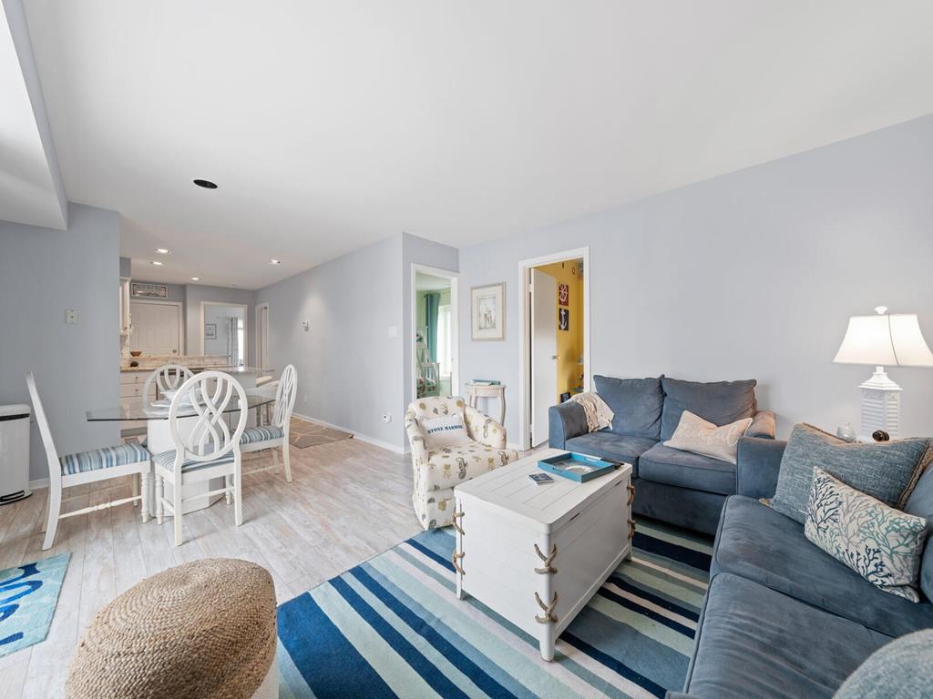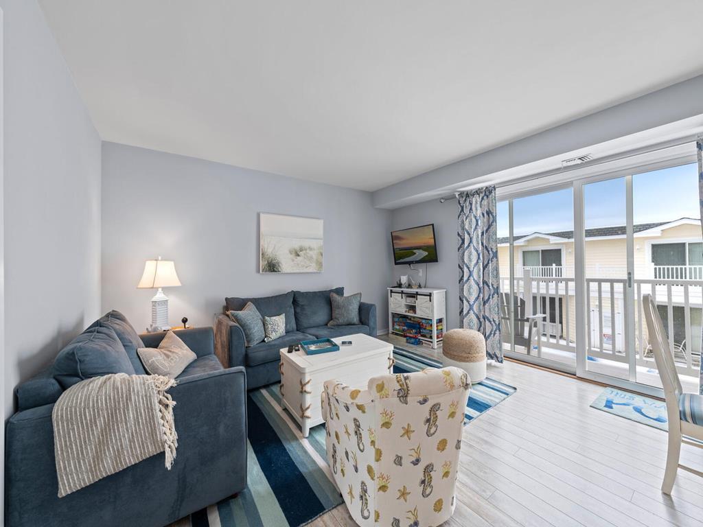 317 83rd Unit 11 is an updated 3 bedroom 1 bath condo unit in the sought after Stone Harbor Gardens. Drop your bags and enjoy your vacation! Enjoy stunning sunset and bay views from the Primary bedroom. The balcony off of the living area features direct access to the community pool. This Condo is conveniently located a half a block to the fishing pier, 2 blocks to the Borough Recreation Center, tennis courts and fields, and 3 blocks to the beach. Also within walking distance to popular restaurants and bars. The under-building car port allows one assigned parking place, a storage closet plus and enclosed outside shower on the ground floor. Unit 11 is on the 3rd floor, no elevator.