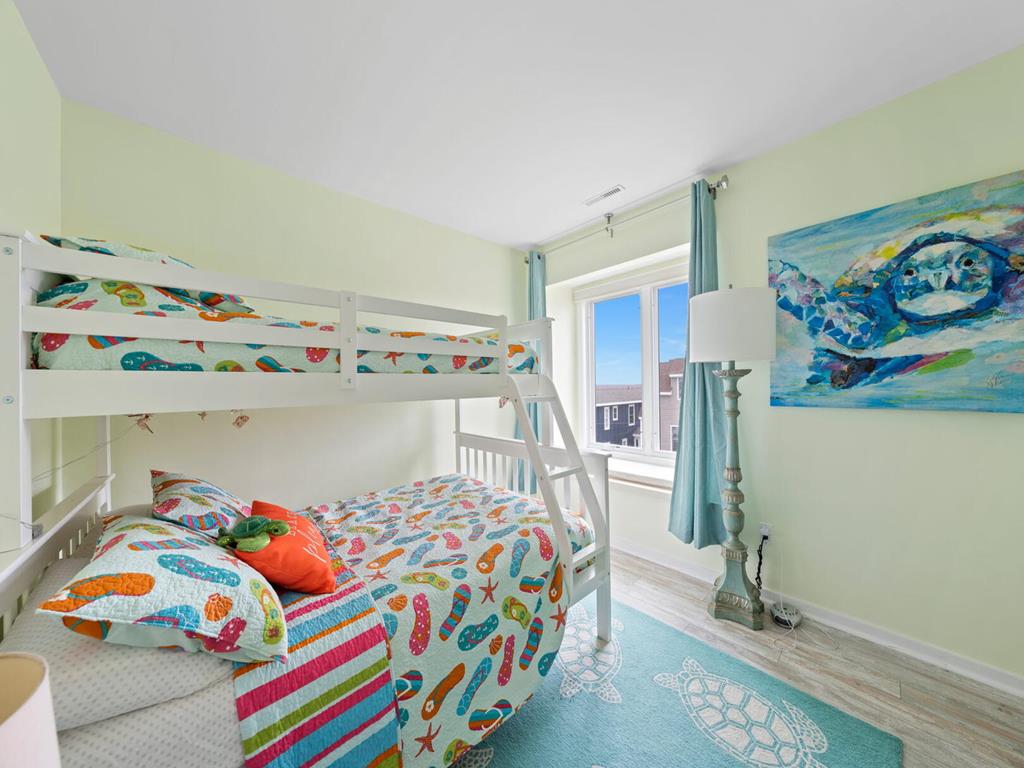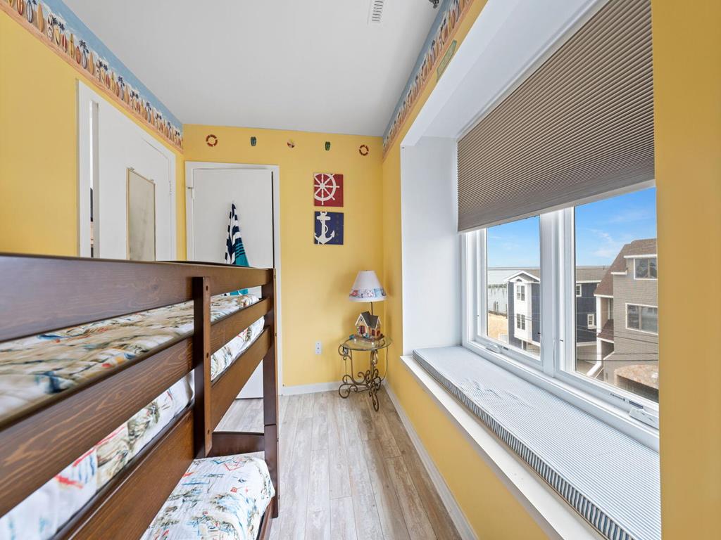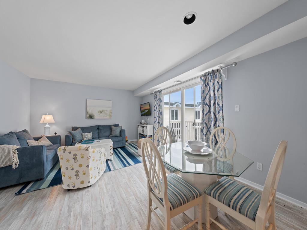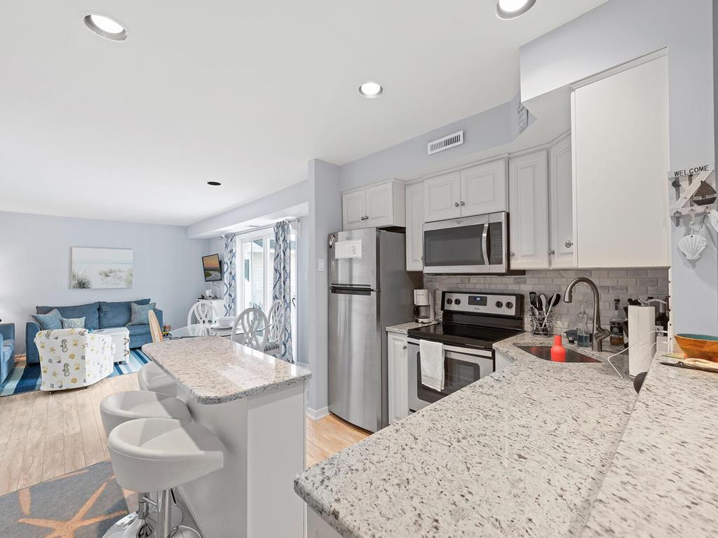 317 83rd Unit 11 is an updated 3 bedroom 1 bath condo unit in the sought after Stone Harbor Gardens. Drop your bags and enjoy your vacation! Enjoy stunning sunset and bay views from the Primary bedroom. The balcony off of the living area features direct access to the community pool. This Condo is conveniently located a half a block to the fishing pier, 2 blocks to the Borough Recreation Center, tennis courts and fields, and 3 blocks to the beach. Also within walking distance to popular restaurants and bars. The under-building car port allows one assigned parking place, a storage closet plus and enclosed outside shower on the ground floor. Unit 11 is on the 3rd floor, no elevator.