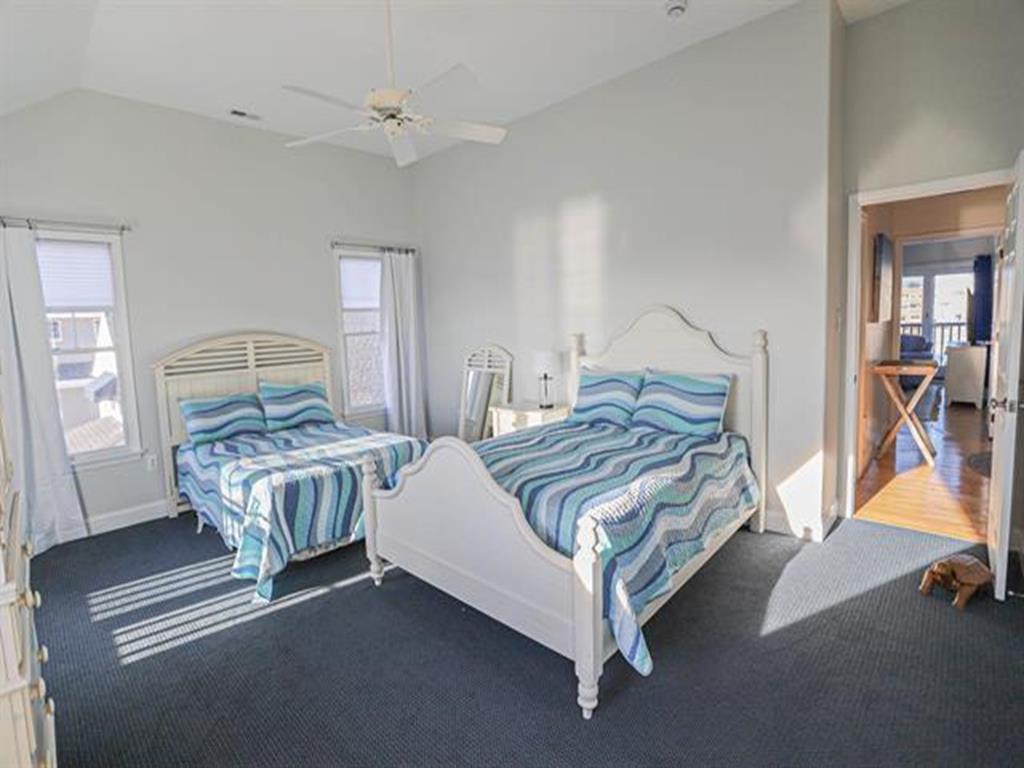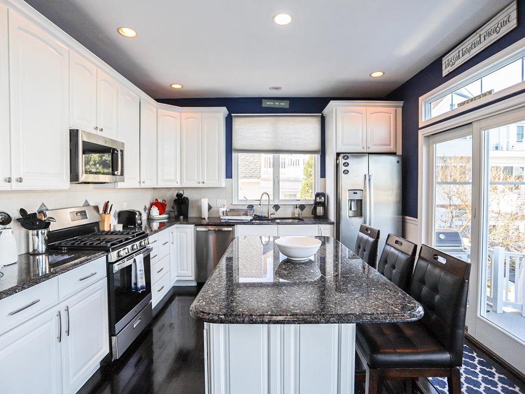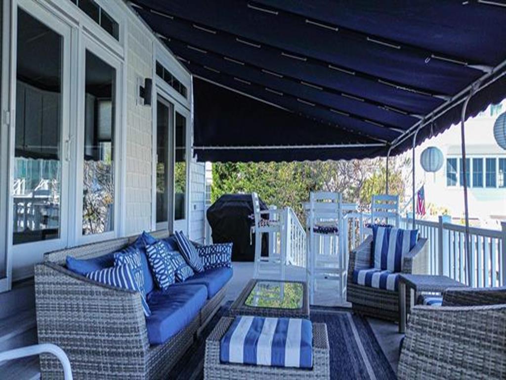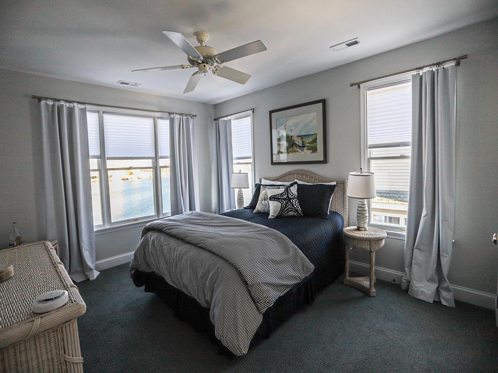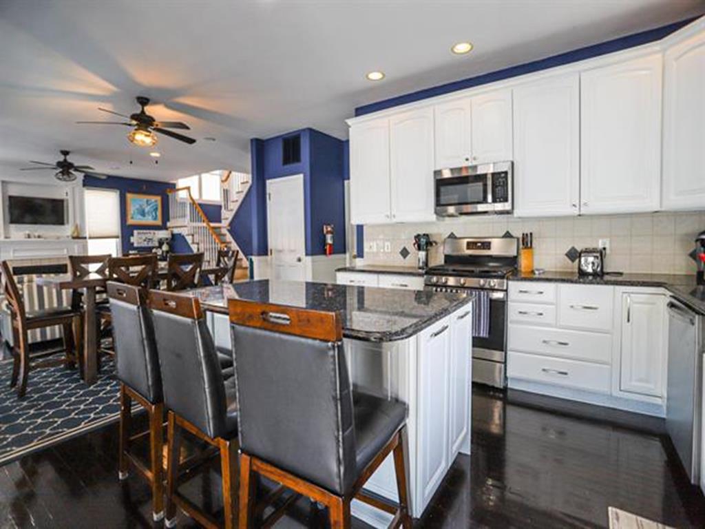 This beautiful bayfront offers 5 bedrooms, 3.5 baths and sleeps 15. First floor has a bedroom with a queen & a twin bed, ensuite tub/bath combo - perfect for any family needing single floor living. Spacious living room and kitchen areas, table seats 6 and the island has an additional seating for three. The second level has four more bedrooms and two full bathrooms. 2 bedrooms each have a queen & double size beds, these bedrooms share a private deck off the front of the house with the third bedroom with a queen. These bedrooms share a hall bath with a tub/shower combo. The master has a king bed and an ensuite with walk in shower. Access to the roof top deck is also off the master. Bay views from all decks and bedrooms. Explore the outdoor area through the three sets of sliders off the living and dining areas that lead to the spacious back deck and private dock overlooking the bay, complete with a boat slip, ready for aquatic adventures. Fire up the gas grill and dine al fresco. A private outdoor shower for rinsing off after a day spent at the beach or on the water. Owner provides beach tags, beach chairs, umbrella, bikes, fishing poles, kayak and an extra refridgerator in garage for your convenience. Store your bikes & beach gear in the garage. Parking for 1 car in the driveway and plenty of off street parking. Walk to dinner, shopping, recreation and the guarded beach. The perfect location!