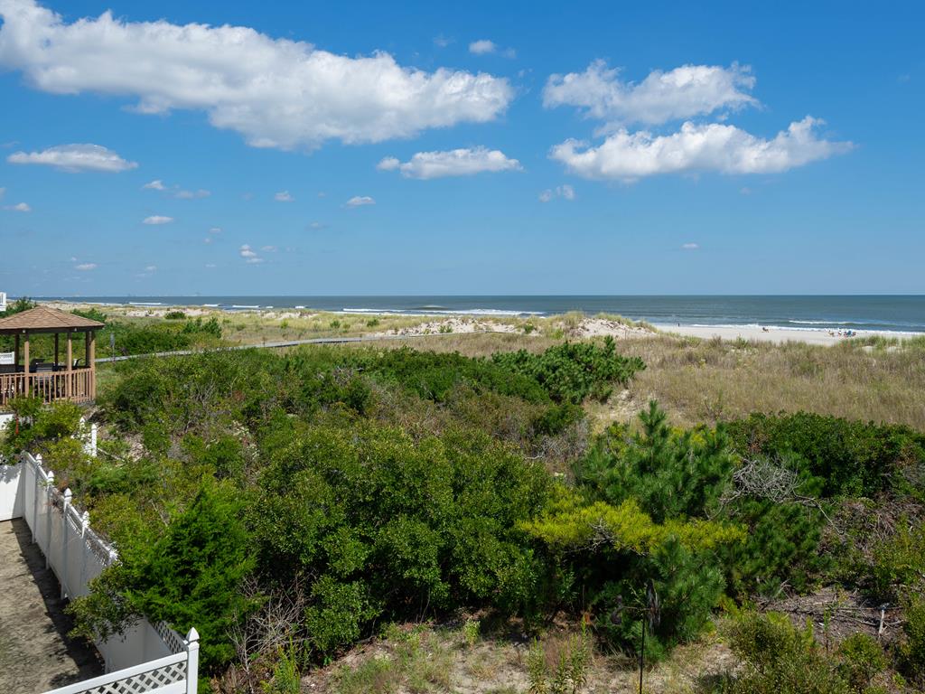 Beach Front! Beautiful 4 bedroom 3.5 bath beachfront home with spacious decks and amazing ocean views. This home has been updated with all new flooring, fresh paint, and renovated kitchen. The first floor has three bedrooms- first one with a Queen bed and a private deck, second with 2 twin beds, and the third with 2 sets of bunk beds. There is also a full bath on this floor. The second floor is the main living area with a spacious living room, dining area, and kitchen with plenty of seating. A large deck is off the living room with unobstructed beach and ocean views. The third floor has the primary bedroom, en-suite bath, and a private deck. This home also has a large carport to store beach gear and an outside shower. This home has stunning ocean views!